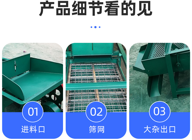 該精選篩為二層篩網(wǎng),先經(jīng)過進(jìn)料口處風(fēng)機(jī)抽風(fēng),直接抽走重量輕的雜葉或麥秸稈,上層篩的初次篩分再把大雜清理過,好的糧食(種子)直接落到下層篩網(wǎng)上,下層篩網(wǎng)會把糧食(種子)中的小雜.小石子.有缺陷的糧食(種子)直接漏掉,完好的糧食(種子)會從出料口篩分出來。該小型清糧機(jī)解決了揚(yáng)場機(jī)的功能單一,不能有效去除石子.土塊的缺陷,更能為清理、凈選糧食(種子)帶來滿意的效果。該機(jī)有占地小,移動方便,便以維修,除塵除雜效率明顯,能耗低,使用簡便等優(yōu)點(diǎn)。真可謂是中小型糧食清理凈選篩中的戰(zhàn)斗機(jī)!