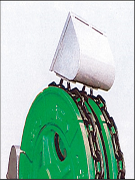 斗式提升機(jī)用來垂直提升經(jīng)過破碎機(jī)的石灰石、煤、石膏、熟料、干粘土等塊粒狀物料以及生料、水泥、煤粉等粉狀物料。根據(jù)料斗運(yùn)行速度的快慢不同,斗式提升機(jī)可分為:離心式卸料、重力式卸料和混合式卸料等三種形式。離心式卸料的斗速較快,適用于輸送粉狀、粒狀、小塊狀等磨琢性小的物料;重力式卸料的斗速較慢,適用于輸送塊狀的,比重較大的,磨琢性大的物料,如石灰石、熟料等。斗式提升機(jī)的牽引構(gòu)件有環(huán)鏈、板鏈和膠帶等幾種。環(huán)鏈的結(jié)構(gòu)和制造比較簡(jiǎn)單,與料斗的連接也很牢固,輸送磨琢性大的物料時(shí),鏈條的磨損較小,但其自重較大。板鏈結(jié)構(gòu)比較牢固,自重較輕,適用于提升量大的提升機(jī),但鉸接接頭易被磨損,膠帶的結(jié)構(gòu)比較簡(jiǎn)單,但不適宜輸送磨琢性大的物料,普通膠帶物料溫度不超過60℃,夾鋼繩膠帶允許物料溫度達(dá)80℃,耐熱膠帶允許物料溫度達(dá)120℃,環(huán)鏈、板鏈輸送物料的溫度可達(dá)250℃。