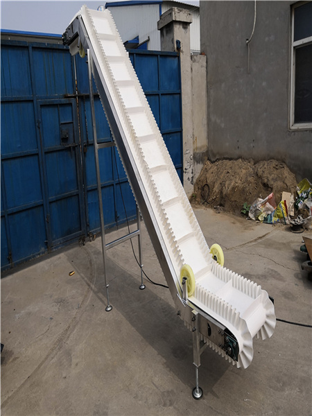 裙邊皮帶輸送機常用于輸送小型、顆粒或粉末狀產(chǎn)品,裙邊為熱熔在輸送帶兩側(cè)波浪起伏狀的帶狀皮帶護邊,為防止微小產(chǎn)品從皮帶縫隙掉落到皮帶輸送機內(nèi)。