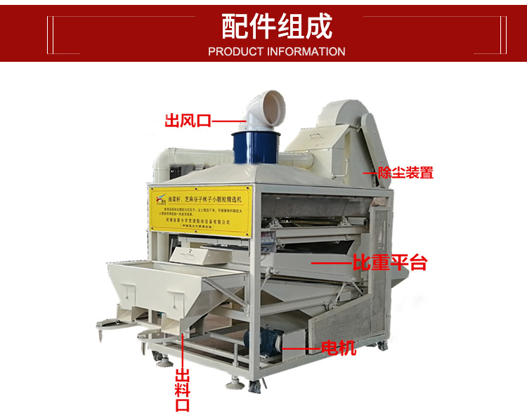 該機按物料大小、重量或外形輪廓的差異進行風選和比重篩選相結合的谷物清選設備。該機采用正壓的方式,利用氣流和振動摩擦對物料產生的綜合作用,比重較大的物料沉降到底層,通過篩面的振動摩擦向高處移動,比重較小的物料經氣流作用則懸浮在料層的表面向低處流動,以達到按比重分離的目的。該機能有效剔除物料中的雜質【霉爛變質粒、蟲蛀粒、黑粉病粒、秕谷粒、芽谷粒、大重雜、小重雜、粉塵等】。該機廣泛用于玉米、小麥、水稻、決明子、大豆、蔬菜等農作物種子和形態(tài)的草籽,如牧草種、園藝種、林木種等種子的清選加工。