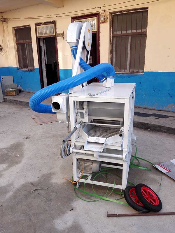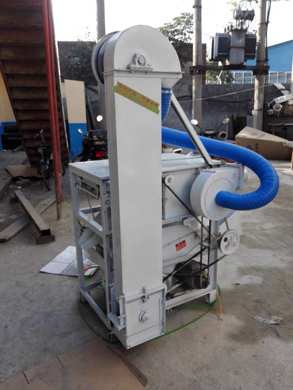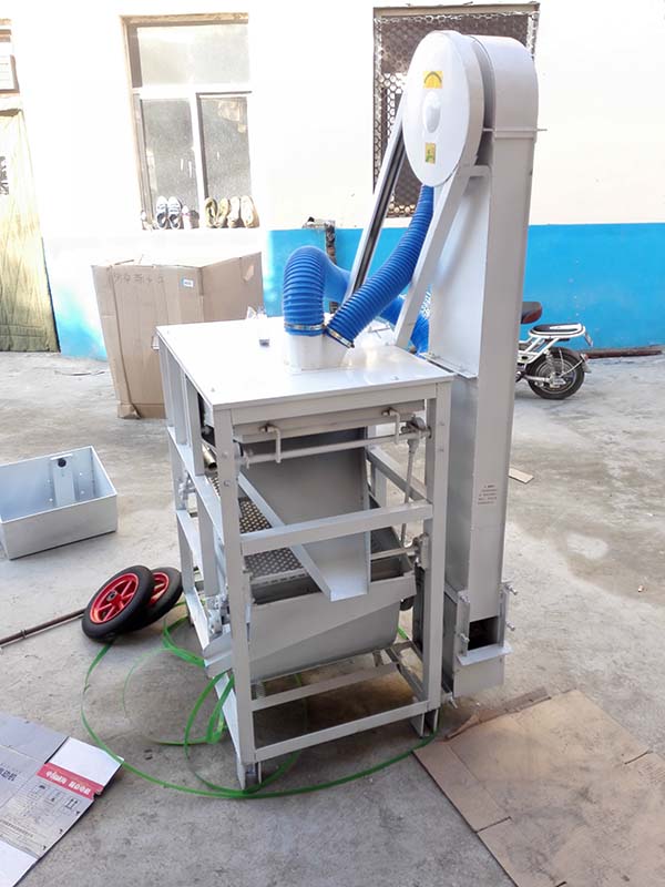 先將機(jī)器放置水平位置,接通電源,啟動(dòng)工作開關(guān),確保電機(jī)順時(shí)針運(yùn)轉(zhuǎn)后,以示該機(jī)進(jìn)入正確工作狀態(tài)。然后把被篩選的物料倒入進(jìn)料斗,根據(jù)物料顆粒大小正確調(diào)整料斗底部的塞板使物料均勻進(jìn)入上層篩網(wǎng)中;同時(shí)也使篩子上部的圓筒風(fēng)機(jī)向篩網(wǎng)出料端正確送風(fēng);風(fēng)機(jī)下端的引風(fēng)口也可直接連接布袋接納谷物中的輕雜廢料。
