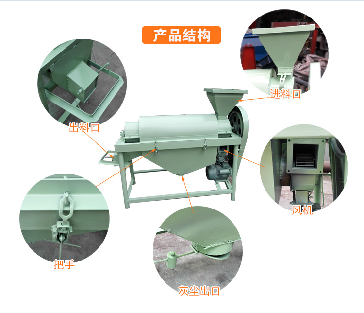 進料口里面有一個調節(jié)擋板可以調節(jié)物料進入多少。出料口為了配合裝袋我們上面有袋子的掛鉤,當然出料口可以根據您的實際情況進行定做,風機就是將水稻芒還有灰塵等輕小物料直接吹出來,電機我們采用的是全銅線圈電機,耐用,質量好。